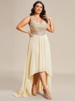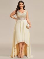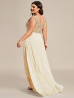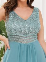 Hold your hearts because this stunning evening dress would make you look like a princess. This plus size evening dress for mature woman features a deep V-neck and is sleeveless. The A-line silhouette of the dress makes it look high-end and fabulous. The paillette designing on the upper body looks stunning as well. This gorgeous dress is perfect for all formal occasions, from evening party, cocktail, weddings to prom, homecoming and graduation!