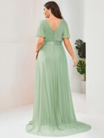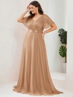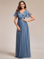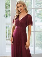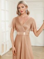 Shiny and sophisticated, indulge in this stunning A-line evening dress for your next special formal event. Short flutter sleeves and a plunging ruched v-neck exude elegance, along with a classic A-line silhouette. A luxe ribbon waist and sheer fabric overlay add a magical moment. Pair this floor-length evening dress with heels or flats and your favorite jewelry at evening party, prom or any special occasion.